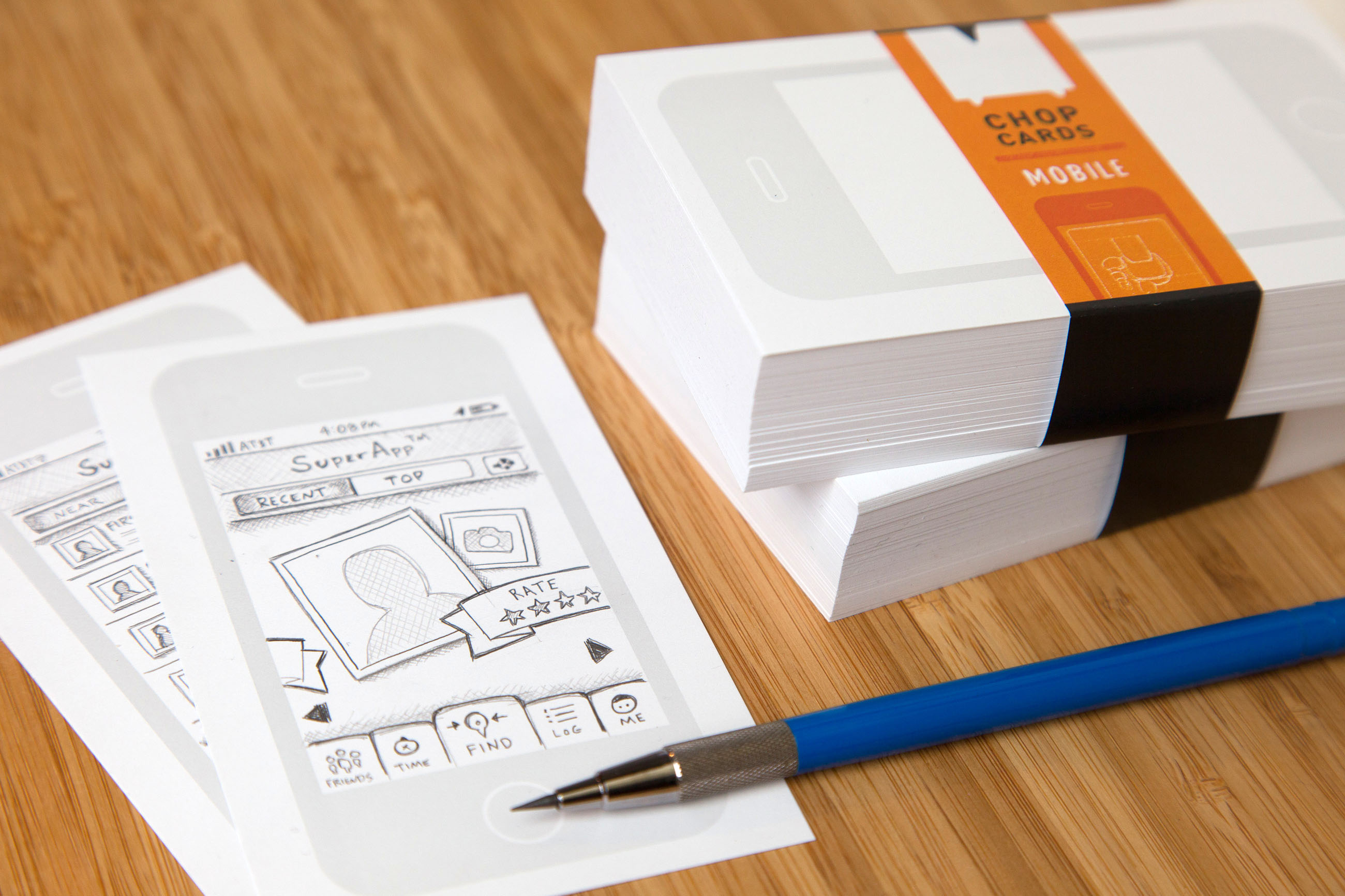 Our Chop Cards are ideal for making your mobile dreams come true! We just got another batch of mobile design index cards back from the printer. Now you too can brainstorm like a pro with one hundred spot-color mobile device frames printed on high quality bright white index cards. Stockpile them for yourself or share them with a team. Pen, pencil, horizontal or vertical, with a handful of these bad boys you are ready to design the crazy future of mobile design!
